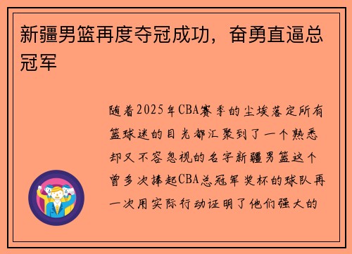 新疆男篮再度夺冠成功,奋勇直逼总冠军