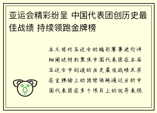 本文将对亚运会的精彩赛事进行详细阐述,特别聚焦中国代表团在本届亚运会中创造的历史最佳战绩,及其在金牌榜上的持续领跑。通过分析中国代表团在多个项目上的优异表现、运动员的个人成就、战略部署及备战情况,以及亚运会整体赛事的影响力和组织运作,我们将展示中国代表团如何在这次亚运会中打破纪录、超越自我,并为亚洲体育史添上浓重的一笔。通过这篇文章,读者将更全面地了解中国代表团在本届亚运会上的表现,以及这背后的努力和意义。