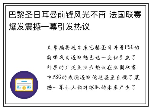 文章摘要:近年来,巴黎圣日耳曼(PSG)的前锋风光逐渐褪色,这一变化引发了外界的广泛关注和热议。在法国联赛中,PSG的表现逐渐低迷,甚至出现了震撼一幕,让人们对球队的未来产生了质疑。本文将从四个方面对这一事件进行详细阐述。首先,分析巴黎圣日耳曼前锋的衰退原因;其次,探讨法国联赛的竞争环境如何影响PSG的成绩;然后,回顾震撼一幕对球队和联赛的影响;最后,讨论这一事件背后的更深层次原因,并展望巴黎圣日耳曼未来的可能走向。本文将结合赛事与外界反应,全面解析巴黎圣日耳曼前锋风光不再的现象及其对法国联赛的深远影响。