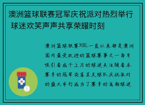 澳洲篮球联赛冠军庆祝派对热烈举行 球迷欢笑声声共享荣耀时刻