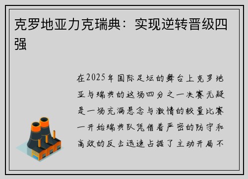 对于足球爱好者而言,这场比赛绝对是一场不容错过的经典之战。从比赛的开局到逆转的胜利,克罗地亚用他们的行动诠释了何为坚持、何为勇气,也让球迷们见识到了顶级赛事中的激烈与震撼。而瑞典队虽然遗憾出局,但他们的表现同样值得尊敬,未来他们定将在国际足坛继续发光发热。