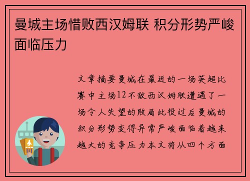曼城主场惜败西汉姆联 积分形势严峻面临压力